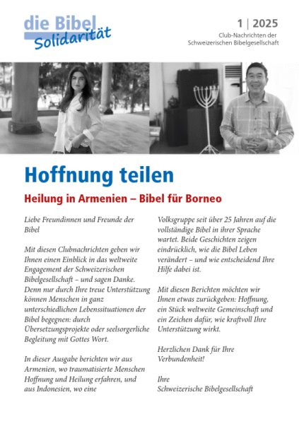 Mit dem Club «die Bibel Solidarität» bietet die Schweizerische Bibelgesellschaft eine besondere Möglichkeit an, die weltweite Verbreitung und Übersetzung der Bibel regelmässig und verbindlich zu fördern.