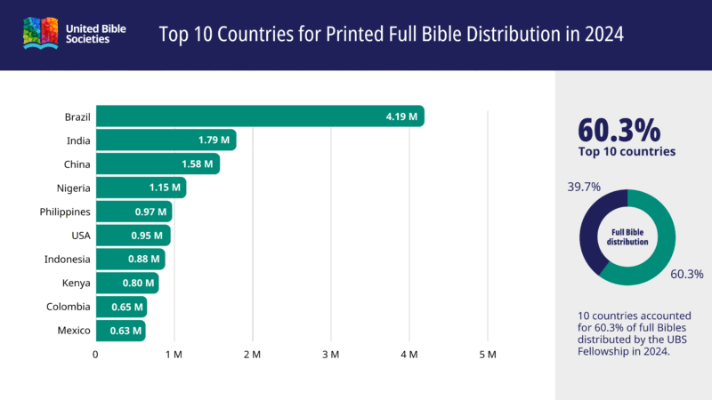 Im Jahr 2024 wurden 60,3 % aller von Bibelgesellschaften verteilten Bibeln in zehn Ländern verteilt. Brasilien bleibt mit 4,2 Millionen verteilten Bibeln führend in der Bibelverteilung. Nach Brasilien folgen Indien (1,8 Millionen Bibeln), China (1,6 Millionen Bibeln), Nigeria (1,2 Millionen Bibeln) und die Philippinen (0,97 Millionen Bibeln). Die Philippinen steigerten ihre Verteilung gedruckter vollständiger Bibeln im Jahr 2024 um etwa 50’000 und belegten damit den fünften Platz. Kolumbien verbesserte sich vom zehnten auf den neunten Platz und verteilte etwa 110.000 gedruckte vollständige Bibeln mehr als im Jahr 2023.