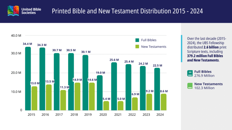In den letzten zehn Jahren (2015–2024) haben sie 2,6 Milliarden gedruckte Bibeln verteilt.