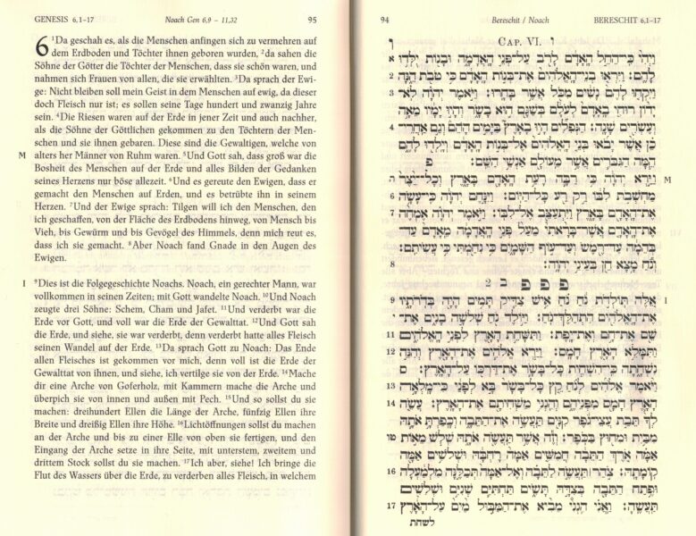 Das gesamte zweisprachige Druckwerk – obwohl es hauptsächlich wegen der Übersetzung gemacht ist – hält sich an die hebräische Schreibkonvention von rechts nach links. Das Deckblatt des Einbands ist «hinten». Man nimmt das Buch und schlägt den Deckel nach rechts auf. Hier – für unser Empfinden «hinten» im Buch – findet sich der Titel und beginnt die Zählung der Seiten bei 1 (beachten Sie die Seitennummerierung). Auch bei der nur in Deutsch geschriebene Einführung ist jeweils zuerst die rechte Seite zu lesen, dann die linke, um danach die Seite nach rechts umzuschlagen.